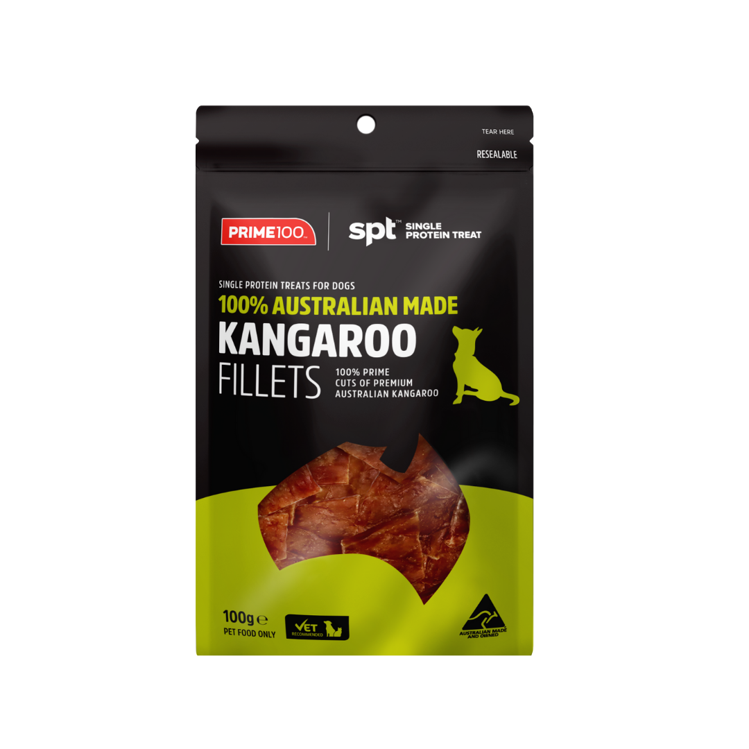 Single protein kangaroo fillet treats made with handpicked kangaroo and minimal ingredients, crafted with the same care as Prime100 Single Protein Diets.