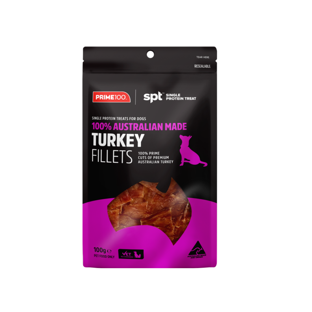 Single protein turkey fillet treats made with handpicked turkey and minimal ingredients, crafted with the same care as Prime100 Single Protein Diets.
