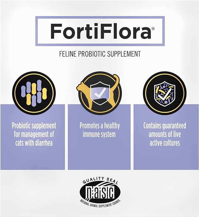 Provide specialized support for your cat by introducing them to Purina Pro Plan Veterinary Supplements FortiFlora probiotic powder cat food supplement for cats with diarrhea. This cat digestive health formula contains a probiotic strain proven to promote intestinal health and balance. Formulated for the dietary management of cats with cat diarrhea, this safe and effective Purina Pro Plan for Cats is simple to administer by adding it to your cat’s food. Each packet of this cat probiotics supplement contains a guaranteed level of live microorganisms that help promote beneficial intestinal microflora. A proprietary microencapsulation process helps enhance the stability and survival of the digestive probiotics in FortiFlora for cats until they reach your cat’s intestinal tract. This Purina Pro Plan sensitive stomach cat food supplement also contains antioxidants to support cat’s immune system. FortiFlora probiotics for cats supplements are appropriate for administration to both kittens and adult cats.